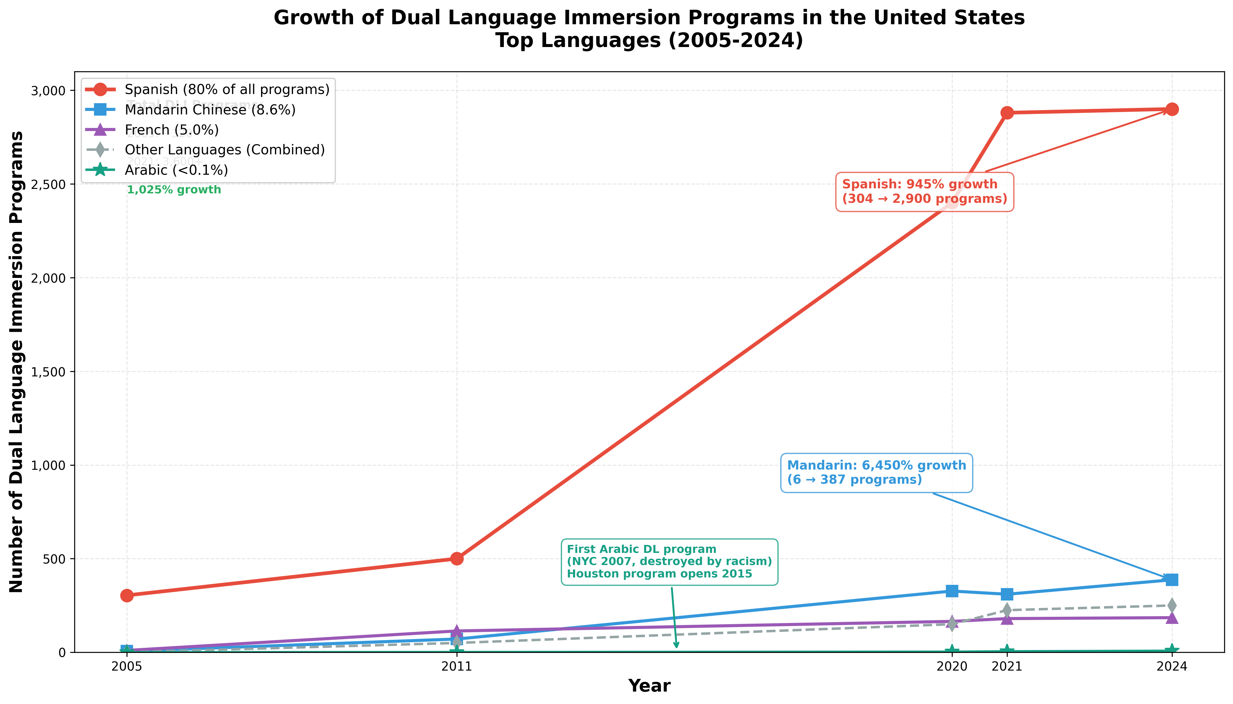 Despite Arabic becoming the fastest-growing language in the United States, with Arabic-speaking English learners rising to become the second-largest group in K-12 schools nationwide—their numbers increasing 75 percent to reach 122,000 students by 2017 and 130,900 by 2021—there are virtually no Arabic dual language immersion programs in the country. The first Arabic dual immersion program, New York City’s Khalil Gibran International Academy, opened in 2007 but was systematically destroyed through coordinated Islamophobic attacks that forced the founding principal to resign and led to the dismantling of its dual-language curriculum. Eight years later, when Houston’s Arabic Immersion Magnet School opened in 2015 as one of the few Arabic dual immersion programs to survive, the principal was met by protesters waving American flags and Islamophobic signs.