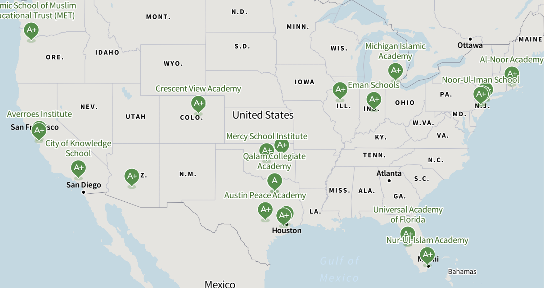 - South (TX, FL, OK, GA): 10 schools (e.g., Austin Peace Academy, Houston Quran Academy, American Youth Academy)